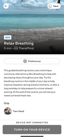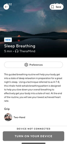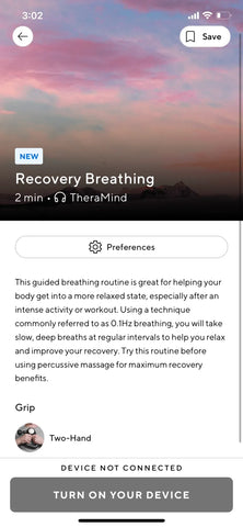 To access breathing routines, download the Therabody app and connect your Theragun device. Select a breathing exercise on the Theragun device or through the Therabody app. The Therabody app has breathing exercises like, “Sleep Breathing," “Recovery Breathing," and “Relax Breathing," to meet users’ needs.