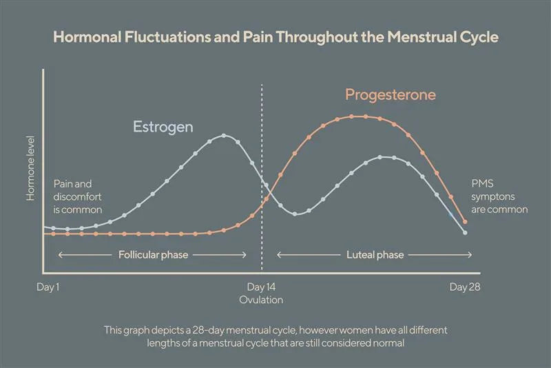 The phases of the menstrual cycle are driven by changing hormone levels (including estrogen and progesterone), which have far-reaching effects on the body. [1]