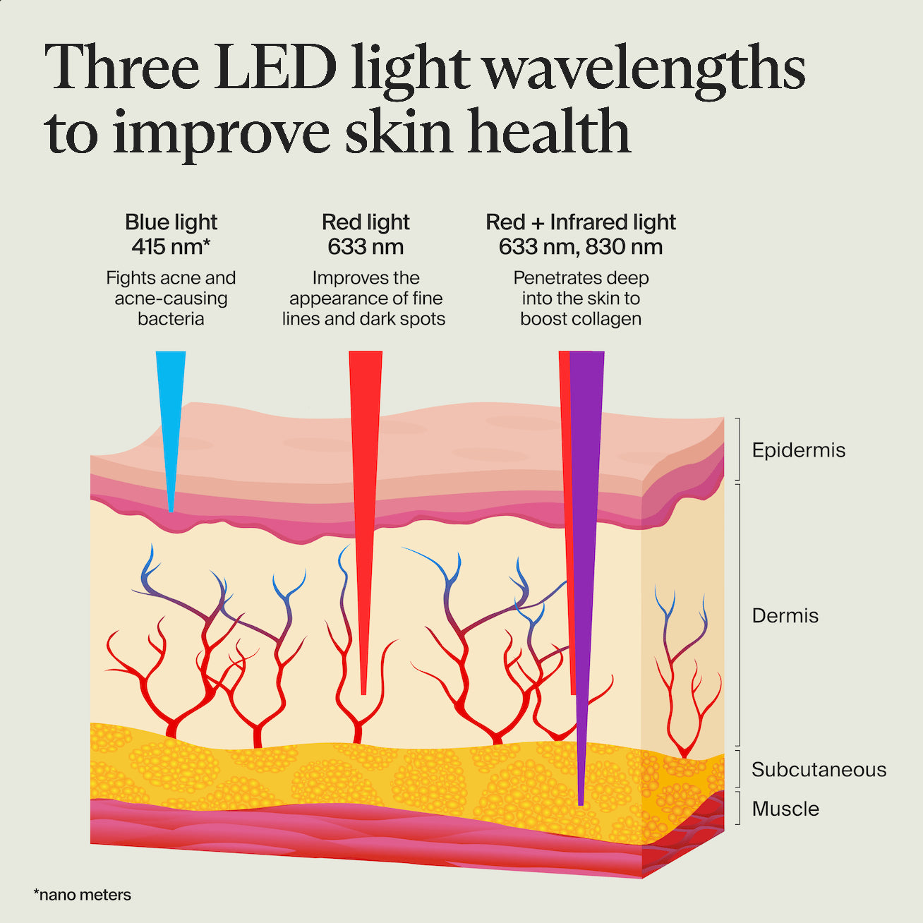 The wavelengths included in your LED mask determine the benefit you'll receive. Different wavelengths of light penetrate the skin at different depths. For example, blue light is a shorter wavelength of light with a lower penetration depth than red light. So, blue light can target the skin's surface while red light can penetrate beneath the skin for benefits at the cellular level.