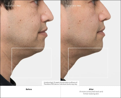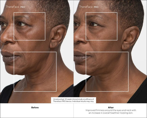 Results: After 12 weeks, TheraFace PRO was clinically shown to improve the following: skin elasticity, skin extensibility, firmness, and facial contour; the appearance and depth of fine lines and wrinkles on the face and around the eyes; skin tone evenness; overall healthy skin appearance; lift the neck and jowl lines; facial contour; visual and tactile smooth skin texture; skin radiance, luminosity, and glow; and skin lifting and the appearance of sagging skin.