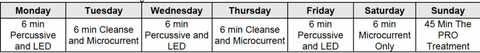 The study protocol included using red, blue, and red+infrared light therapy in combination with percussive therapy treatments three times per week for 6 minutes on Monday, Wednesday, and Friday. Participants used the microcurrent and cleanse attachments twice weekly for 6 minutes on Tuesday and Thursday. Once per week, participants used the comprehensive PRO treatment of light, percussive therapy, microcurrent therapy, cleansing, heat, and cold therapy for 45 minutes on Sunday.